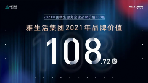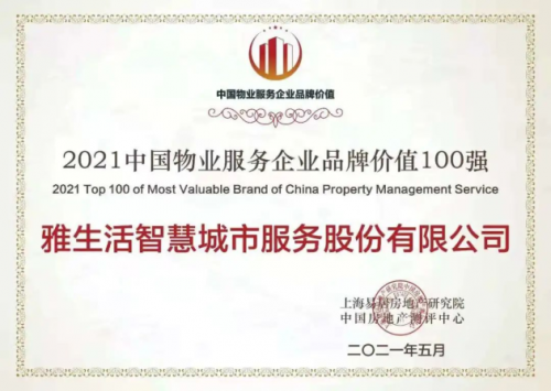 雅生活集團作為中國物業管理行業百強TOP4,榮獲“2021中國物業服務企業品牌價值100強”,憑借優異穩定的市場表現,實施“智慧城市服務商戰略”使雅生活品牌影響力與發展潛力走在行業前沿,品牌價值再創新高達到108.72億,品牌實力更上新臺階。